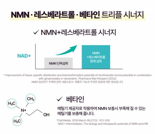 이번 제품은 NMN(니코틴아미드 모노뉴클레오타이드)을 중심으로 레스베라트롤과 베타인의 3가지 핵심 식물성 성분을 배합해 NAD⁺ 생성과 재활용 과정을 강화하고 서투인(SIRTUIN) 활성화를 통해 노화 예방 및 미토콘드리아 대사 증진을 돕는 것이 특징이다.