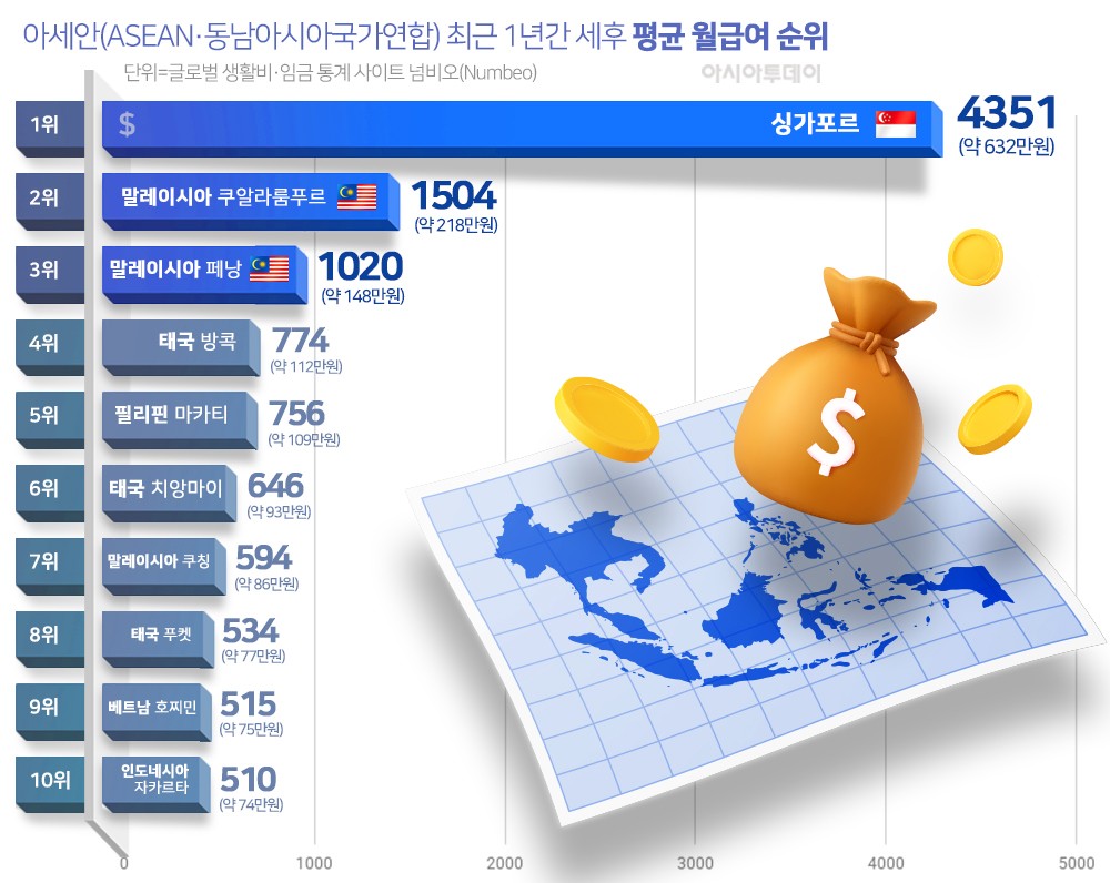 아세안에서 평균 급여가 가장 높은 도시는 싱가포르였다. 4351달러(약 632만원)로 압도적인 1위를 차지했다. 쿠알라룸푸르 다음인 3위는 1020달러(약 148만원)를 기록한 말레이시아 페낭으로 확인됐다.